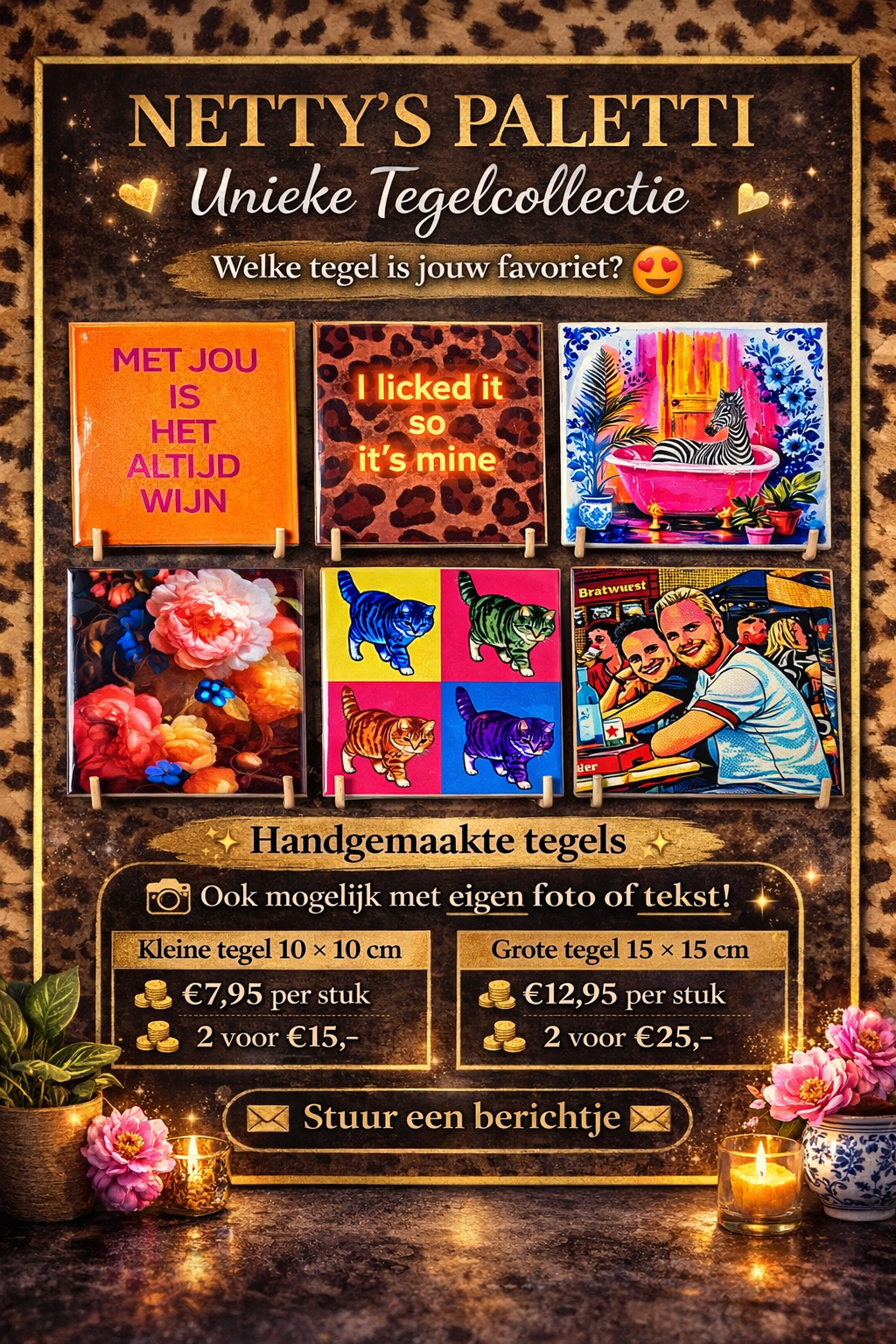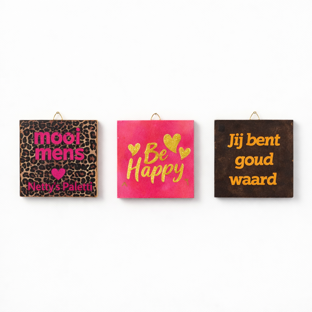 Kiezen voor Netty's Paletti betekent kiezen voor originaliteit, eindeloze mogelijkheden en een eerlijke prijs. Onze zelfontworpen tegels bieden een unieke uitstraling die je nergens anders vindt. Combineer dit met de optie om jouw eigen foto's en teksten te laten drukken, en je hebt een product dat volledig aan jouw wensen voldoet. Wij geloven dat kwaliteit en creativiteit betaalbaar moeten zijn, en dat zie je terug in onze scherpe prijzen. Ontdek het zelf en geef je interieur of cadeau een persoonlijke en unieke touch!